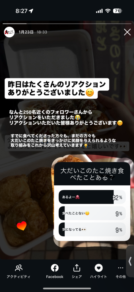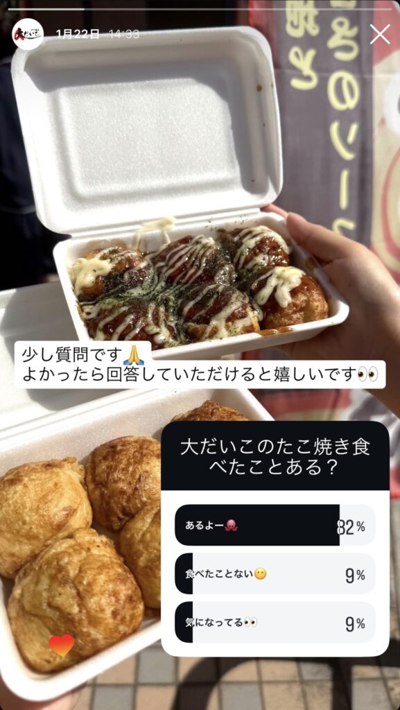アンケートの回答結果を翌日などに共有することで、回答してくれた人が「昨日のアンケートの結果だ!」となり返事が返ってきたような印象を受けます。フォロワー様・お客様への感謝を伝えるような内容定期的に上げるべきなので是非ご参考ください。