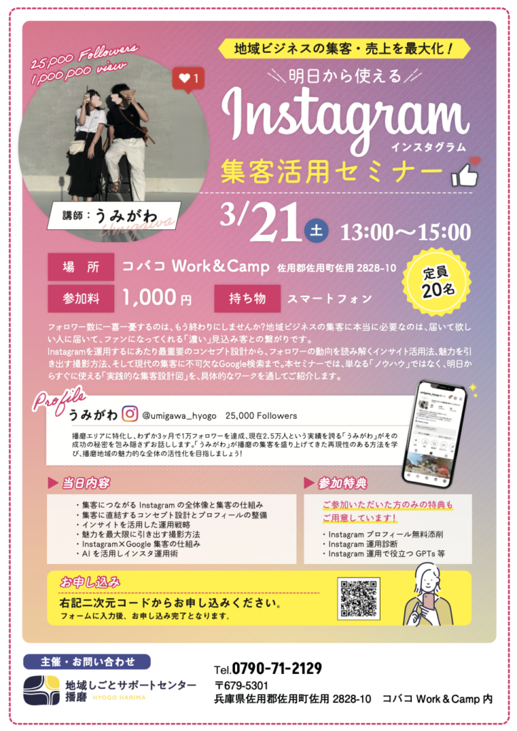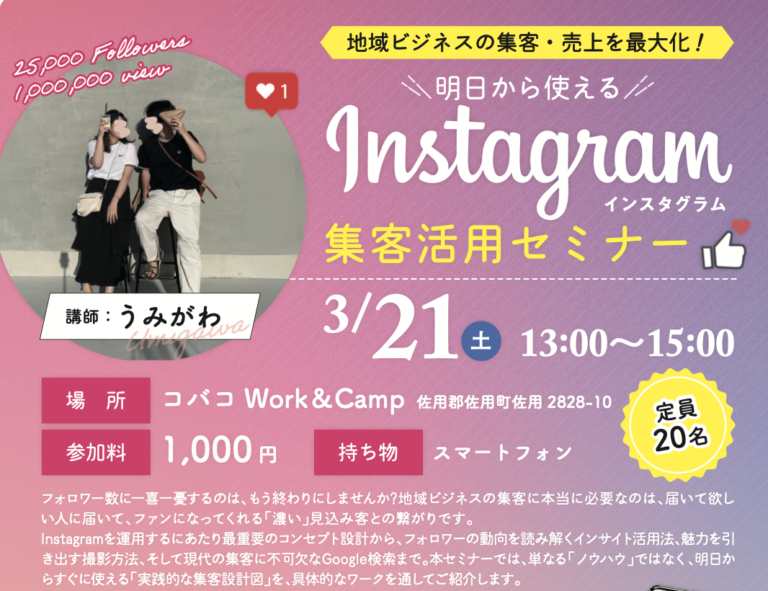 持ち物: 筆記用具、スマ【2026年3月21日(土)開催】Instagram集客活用セミナー | コバコWork&Campで開催ートフォン(Instagramアプリをインストールしておいてください)