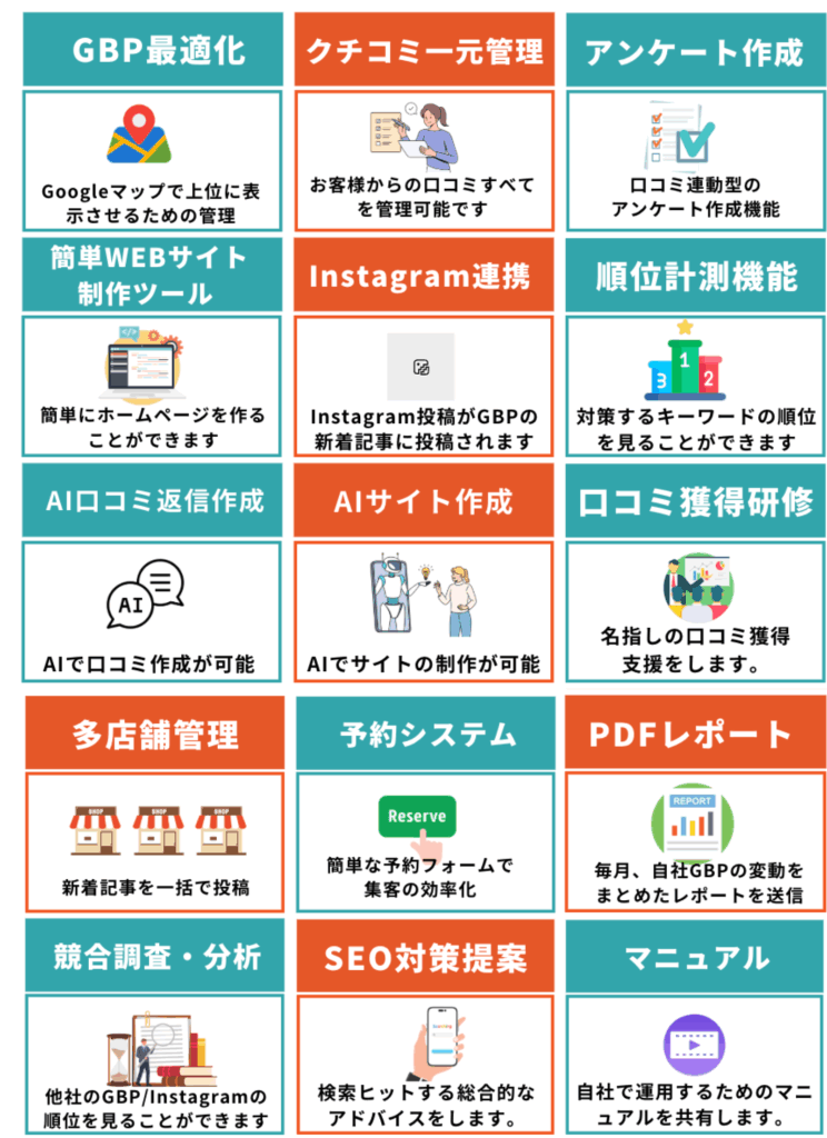 Googleマップ(MEO)を活用した集客支援を中心に、来店促進からリピート獲得まで、店舗運営に関する幅広い課題をサポートする総合ツールです。
